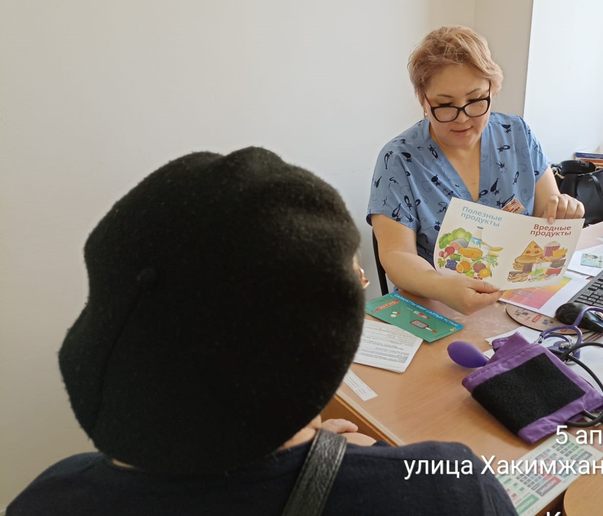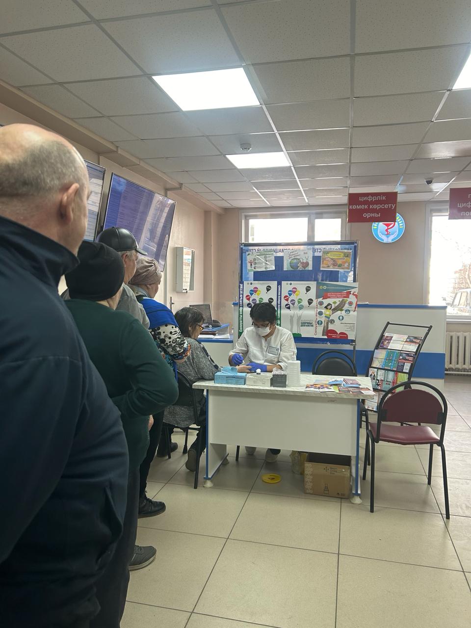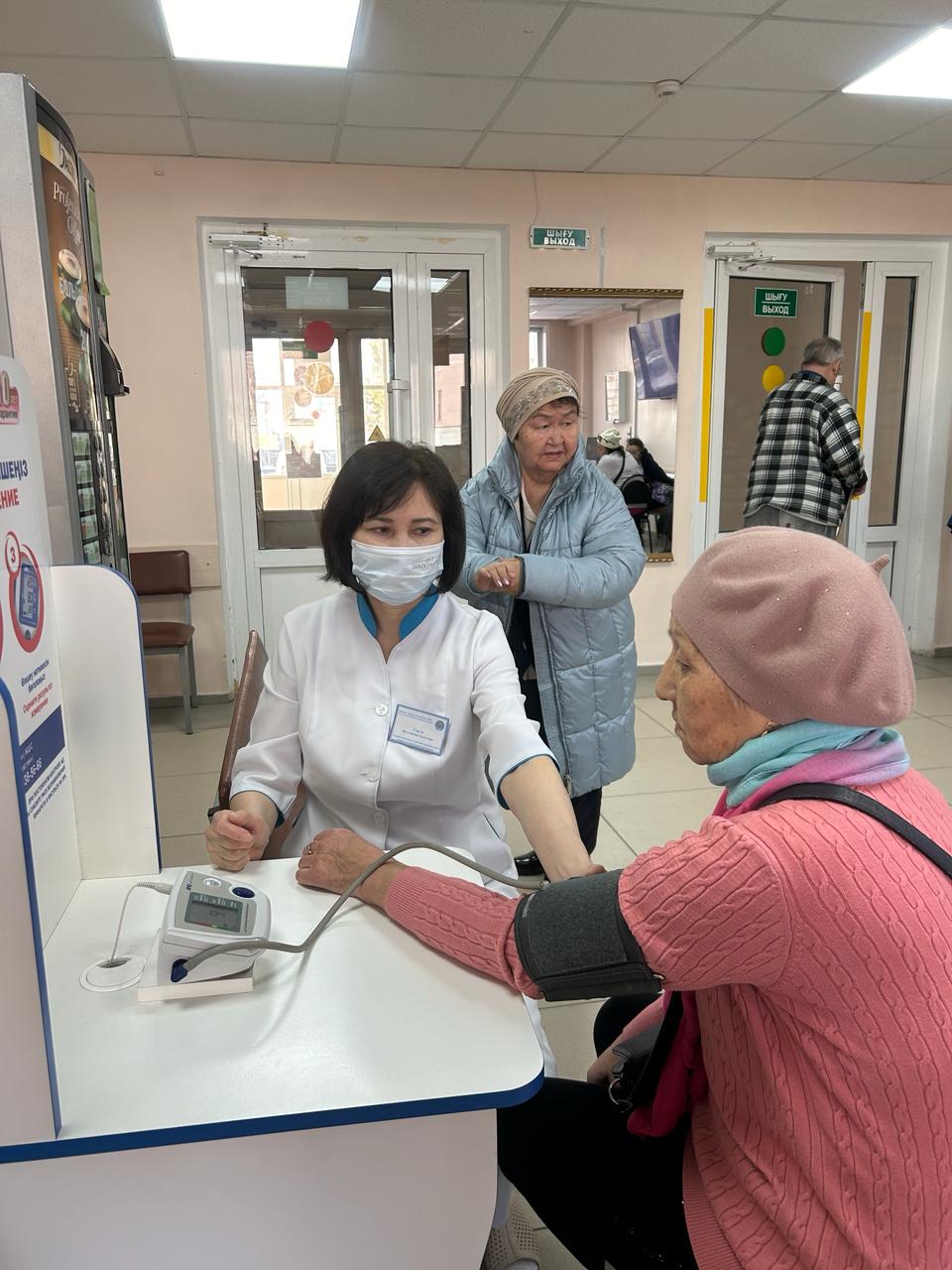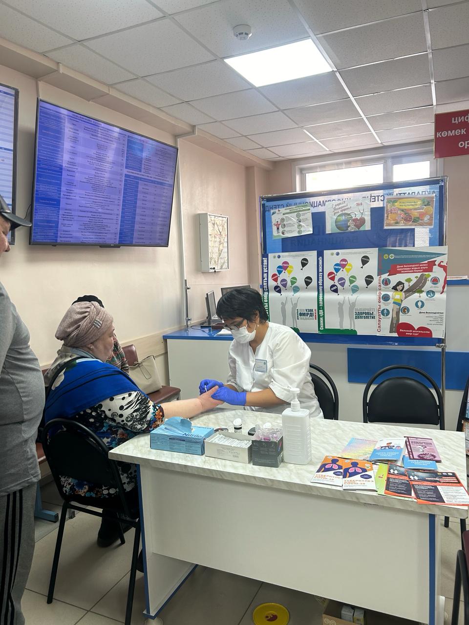 Емханада Пациенттерге арналған ”белсенділік-ұзақ өмір сүру жолы!». Емхананың залында профилактика және әлеуметтік психологиялық көмек бөлімшесінің медбикелері қан қысымын өлшеп, дене салмағының индексін, бойын, қандағы глюкоза мен холестерин деңгейін экспресс әдісімен анықтады.