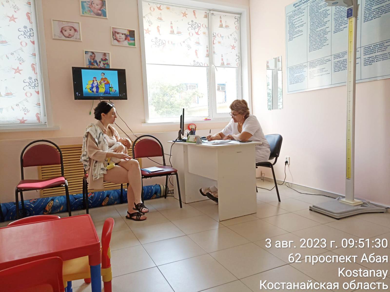 Емхананың LED-экрандарында емшек емізуді, СӨС насихаттау бойынша бейнероликтер көрсетілді.